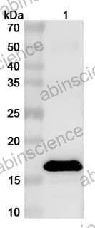 Western blot analysis was performed using anti-M-PDCoV polyclonal antibody at 1ug/mL on various samples. Lane 1: recombinant PDCoV M/Membrane protein (Catalog No: VK779012)