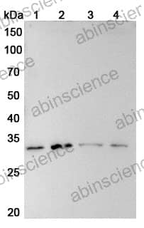 Western blot analysis was performed using anti-SOCS1 polyclonal antibody at 1ug/mL on various samples. Lane 1: K562 cell lysate Lane 2: Hepg2 cell lysate Lane 3: A549 cell lysate Lane 4: Mouse spleen lysate