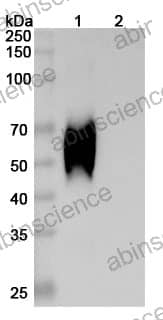 Western blot analysis was performed using anti-HCV E2 monoclonal antibody at 1ug/mL on various samples. Lane 1: recombinant HCV NS1/gp68/gp70/Envelope glycoprotein E2 (Catalog No: VK681011) Lane 2: negative control