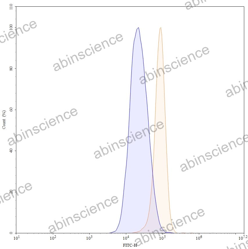 Flow-cytometry using anti-human CD33 antibody. U937 cells were stained with an irrelevant antibody (Blue Histogram) or an anti-human CD33 monoclonal antibody (Catalog: HB185056, Yellow Histogram) at a concentration of 5 µg/ml for 30 mins at RT. After washing, bound antibody was detected using a Goat Anti-Human IgG H&L Polyclonal Antibody, FITC (abinScience: HF690414) and cells analysed on a NovoCyte Flow Cytometer. |