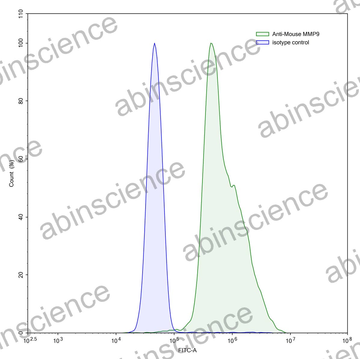 Flow-cytometry using anti-mouse MMP9 antibody.MMP9 Transfected CHO cells were stained with an irrelevant antibody (Blue Histogram) or an anti-mouse MMP9 antibody monoclonal antibody (Catalog # MB945023 ,Green Histogram) at a concentration of 5 µg/ml for 30 mins at RT. After washing, bound antibody was detected using a FITC conjugated goat anti-mouse antibody (Catalog # MF690414) and cells analysed on a NovoCyte Flow Cytometer. |