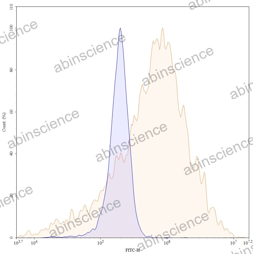 Flow-cytometry using anti-human CD47 antibody. Untransfected cells (blue Histogram) and Transfected cells (Yellow Histogram) were stained with an anti-human CD47 monoclonal antibody (Catalog: HC359036) at a concentration of 5 µg/ml for 30 mins at RT. After washing, bound antibody was detected using a Goat Anti-Human IgG H&L Polyclonal Antibody, FITC (abinScience: HF690414) and cells analysed on a NovoCyte Flow Cytometer. |