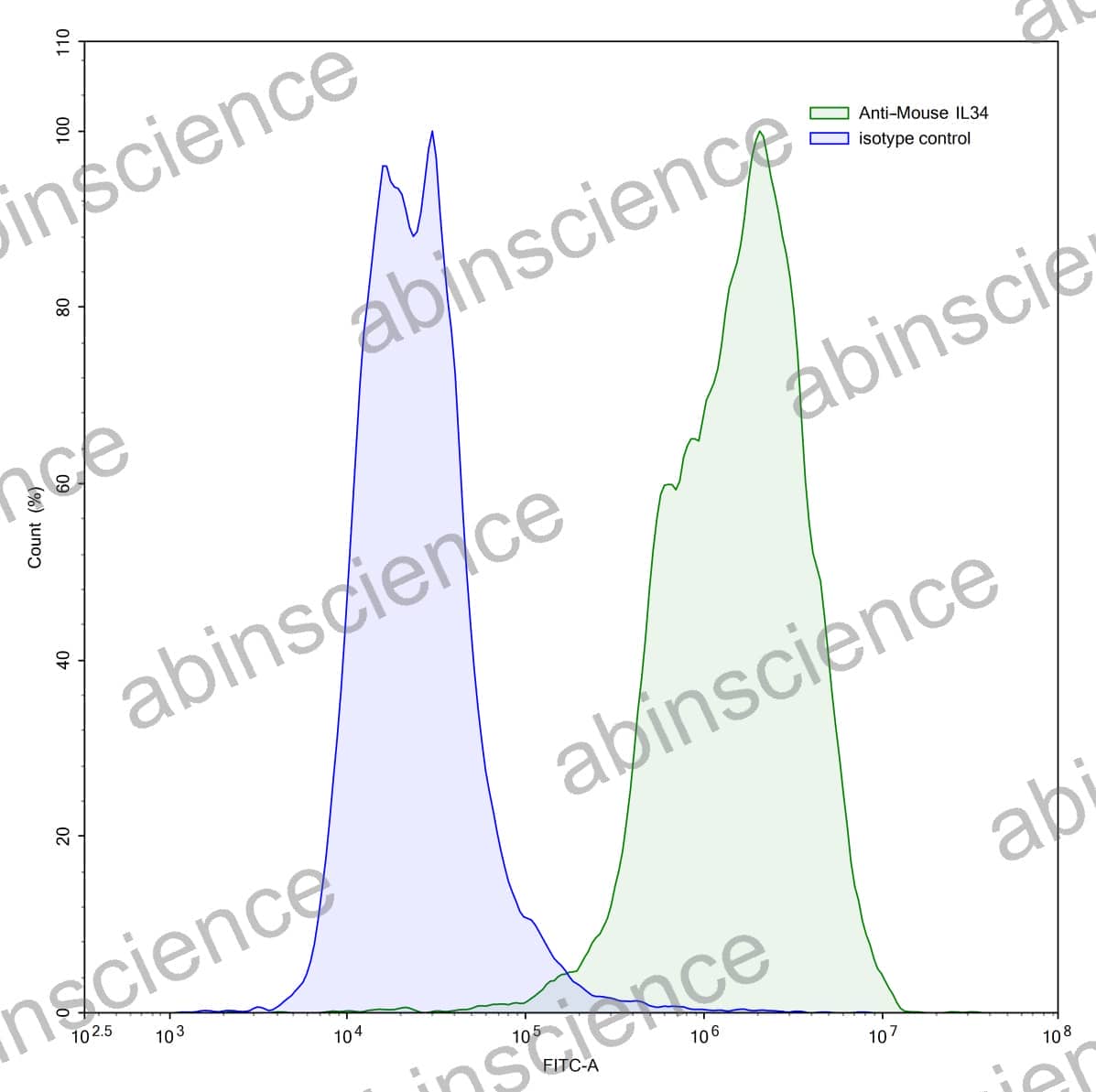 Flow-cytometry using anti-mouse IL34 antibody.IL34 Transfected CHO cells were stained with an irrelevant antibody (Blue Histogram) or an anti-mouse IL34 antibody monoclonal antibody (Catalog # MV955023 ,Green Histogram) at a concentration of 5 µg/ml for 30 mins at RT. After washing, bound antibody was detected using a FITC conjugated goat anti-mouse antibody (Catalog # MF690414) and cells analysed on a NovoCyte Flow Cytometer.