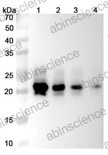 Western blot analysis was performed using anti-IL6 monoclonal antibody at 1μg/ml on various samples. Lane 1: recombinant human IL6 (Catalog No: HY328021), 50ng Lane 2: recombinant human IL6 (Catalog No: HY328021), 30ng Lane 3: recombinant human IL6 (Catalog No: HY328021), 20ng Lane 4: recombinant human IL6 (Catalog No: HY328021), 10ng
