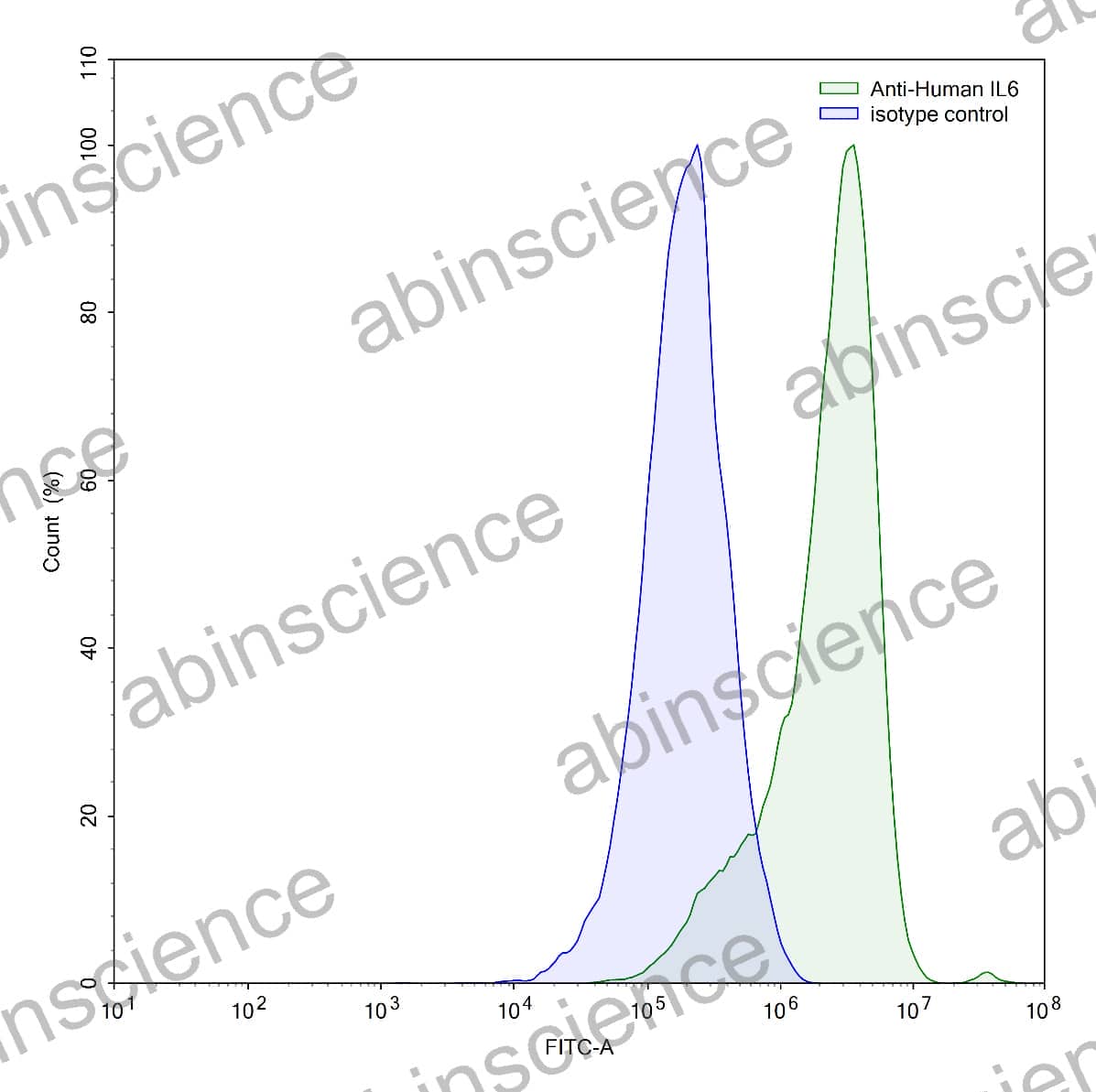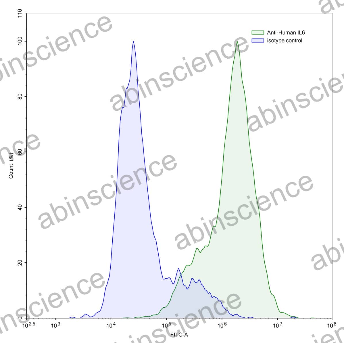 Flow-cytometry using anti-human IL6 antibody.LPS treated THP-1 cells were stained with an irrelevant antibody (Blue Histogram) or an anti-human IL6 antibody monoclonal antibody (Catalog # HY328010 ,Green Histogram) at a concentration of 5 µg/ml for 30 mins at RT. After washing, bound antibody was detected using a FITC conjugated goat anti-human antibody (Catalog # HF690414) and cells analysed on a NovoCyte Flow Cytometer.