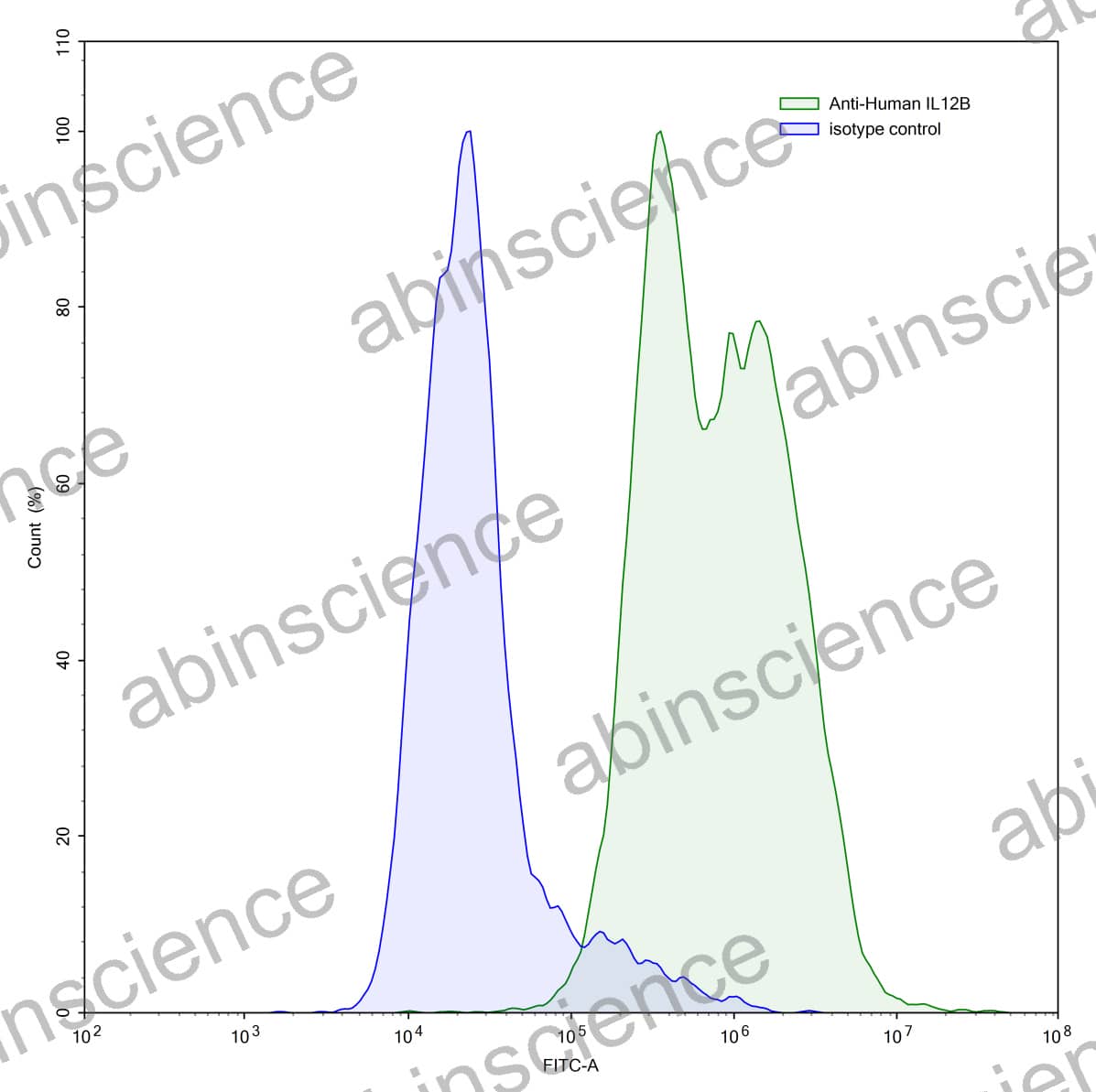 Flow-cytometry using anti-human IL12B antibody.IL12B Transfected CHO cells were stained with an irrelevant antibody (Blue Histogram) or an anti-human IL12B antibody monoclonal antibody (Catalog # HB769010 ,Green Histogram) at a concentration of 5 µg/ml for 30 mins at RT. After washing, bound antibody was detected using a FITC conjugated goat anti-human antibody (Catalog # HF690414) and cells analysed on a NovoCyte Flow Cytometer. |