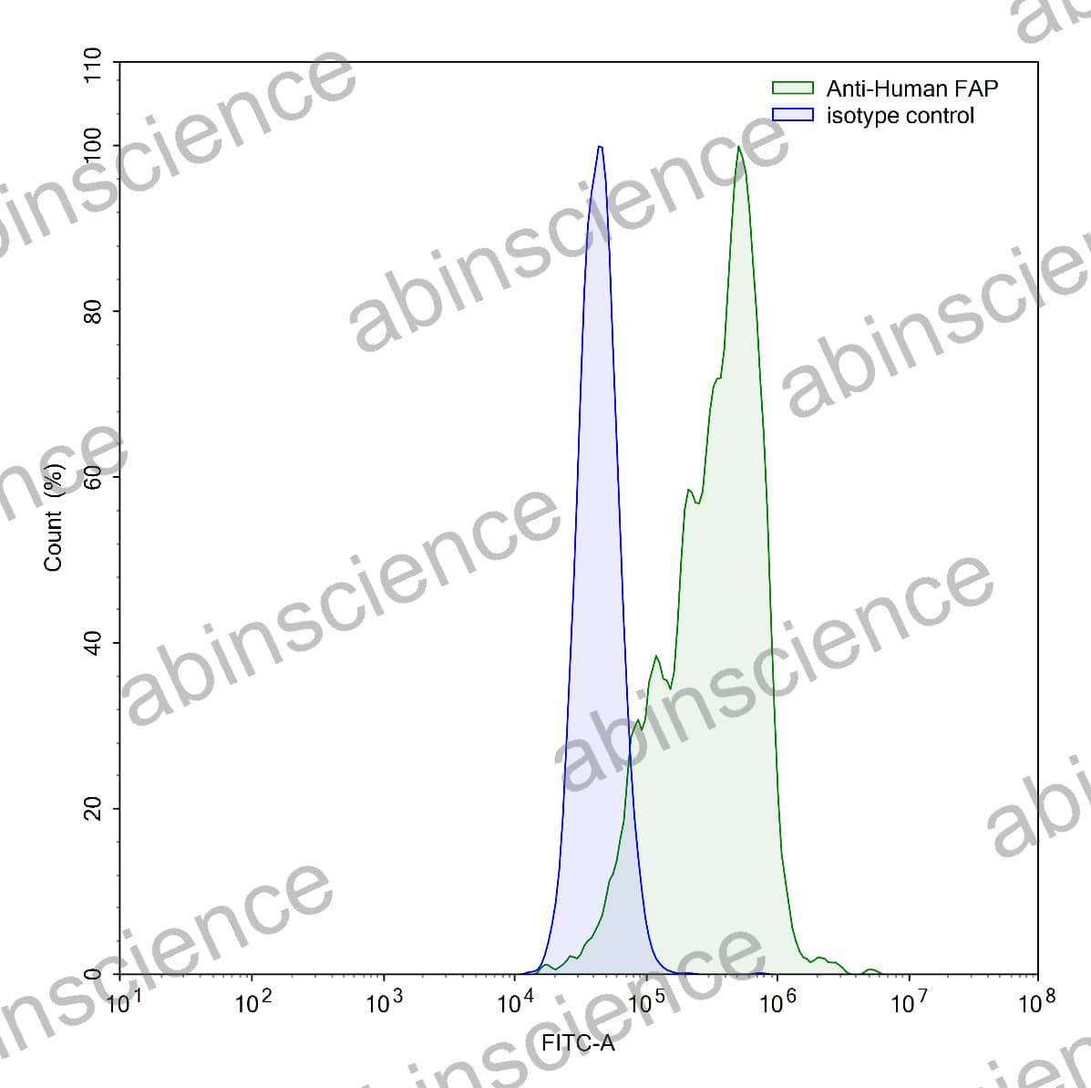 Flow-cytometry using anti-human FAP antibody.U87 cells were stained with an irrelevant antibody (Blue Histogram) or an anti-human FAP antibody monoclonal antibody (Catalog # HC440010 ,Green Histogram) at a concentration of 5 µg/ml for 30 mins at RT. After washing, bound antibody was detected using a FITC conjugated goat anti-human antibody (Catalog # HF690414) and cells analysed on a NovoCyte Flow Cytometer. |