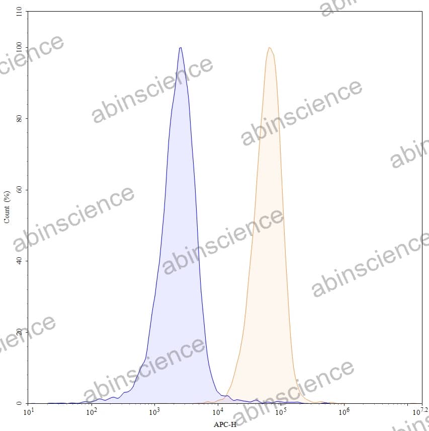 Flow-cytometry using APC anti-human EMR1 antibody. Untransfected cells (blue Histogram) and Transfected cells (Yellow Histogram) were stained with an APC anti-human EMR1 monoclonal antibody (Catalog: HC268013) at a concentration of 5 µg/ml for 30 mins at RT. After washing, cells analysed on a NovoCyte Flow Cytometer. |