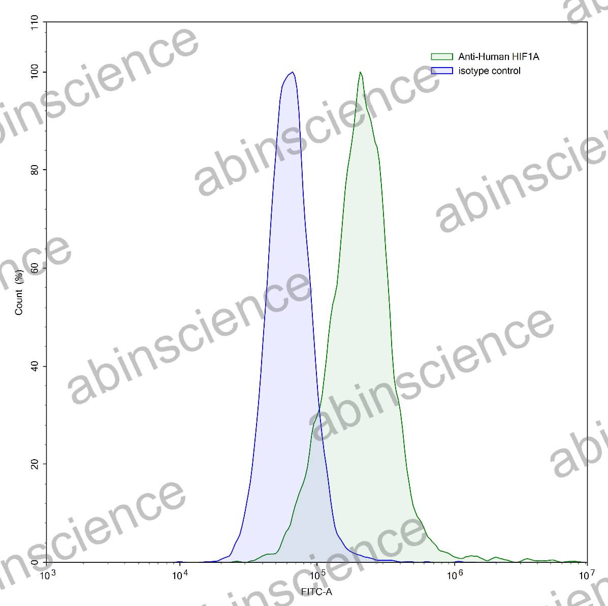 Flow-cytometry using anti-human HIF1A antibody.HeLa cells were stained with an irrelevant antibody (Blue Histogram) or an anti-human HIF1A antibody monoclonal antibody (Catalog # HS858013 ,Green Histogram) at a concentration of 5 µg/ml for 30 mins at RT. After washing, bound antibody was detected using a FITC conjugated goat anti-mouse antibody (Catalog # MF690414) and cells analysed on a NovoCyte Flow Cytometer. |
