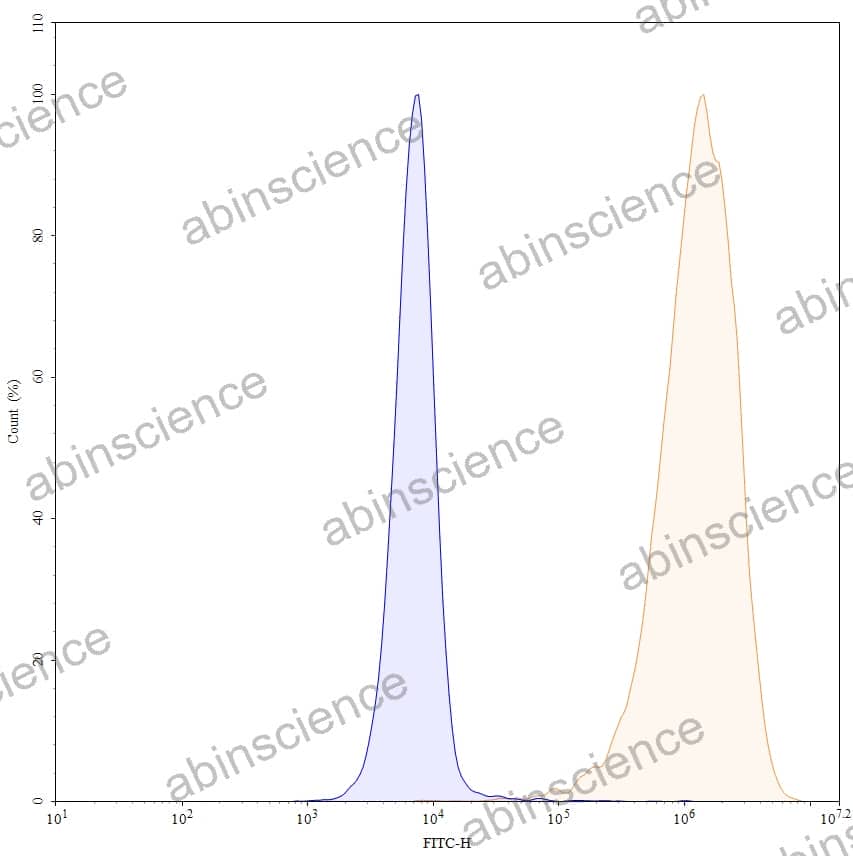 Flow-cytometry using anti-human CD274 antibody. Untransfected cells (blue Histogram) and Transfected cells (Yellow Histogram) were stained with an anti-human CD274 monoclonal antibody (Catalog: HV974216) at a concentration of 5 µg/ml for 30 mins at RT. After washing, bound antibody was detected using a Goat Anti-Human IgG H&L Polyclonal Antibody, FITC (abinScience: HF690414) and cells analysed on a NovoCyte Flow Cytometer.