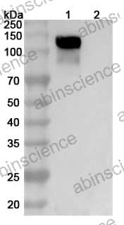 Western blot analysis was performed using anti-ROBO1 monoclonal antibody at 1ug/mL on various samples. Lane 1: recombinant human ROBO1 (Catalog No: HP485011) Lane 2: negative control