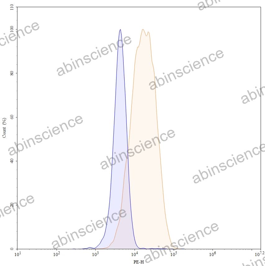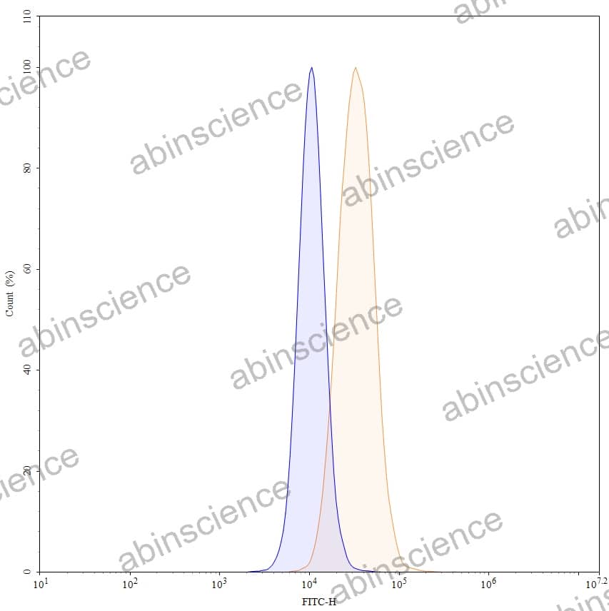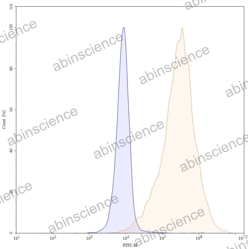 Flow-cytometry using anti-human CDH6 antibody. Untransfected cells (blue Histogram) and Transfected cells (Yellow Histogram) were stained with an anti-human CDH6 monoclonal antibody (Catalog: HX881016) at a concentration of 5 µg/ml for 30 mins at RT. After washing, bound antibody was detected using a Goat Anti-Human IgG H&L Polyclonal Antibody, FITC (abinScience: HF690414) and cells analysed on a NovoCyte Flow Cytometer. |