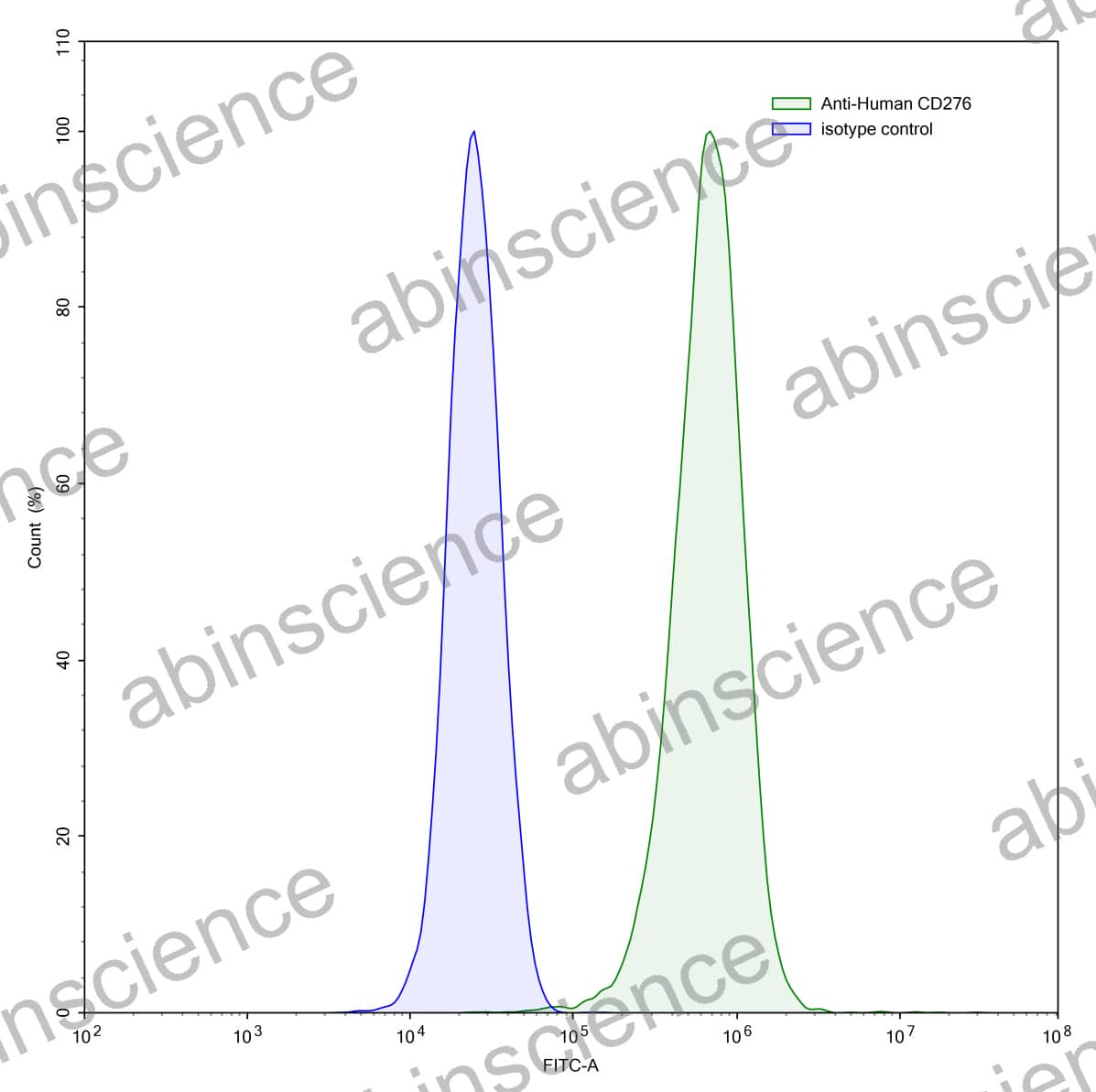 Flow-cytometry using anti-human CD276 antibody.PC-3 cells were stained with an irrelevant antibody (Blue Histogram) or an anti-human CD276 antibody monoclonal antibody (Catalog # HV612013 ,Green Histogram) at a concentration of 5 µg/ml for 30 mins at RT. After washing, bound antibody was detected using a FITC conjugated goat anti-human antibody (Catalog # HF690414) and cells analysed on a NovoCyte Flow Cytometer. |