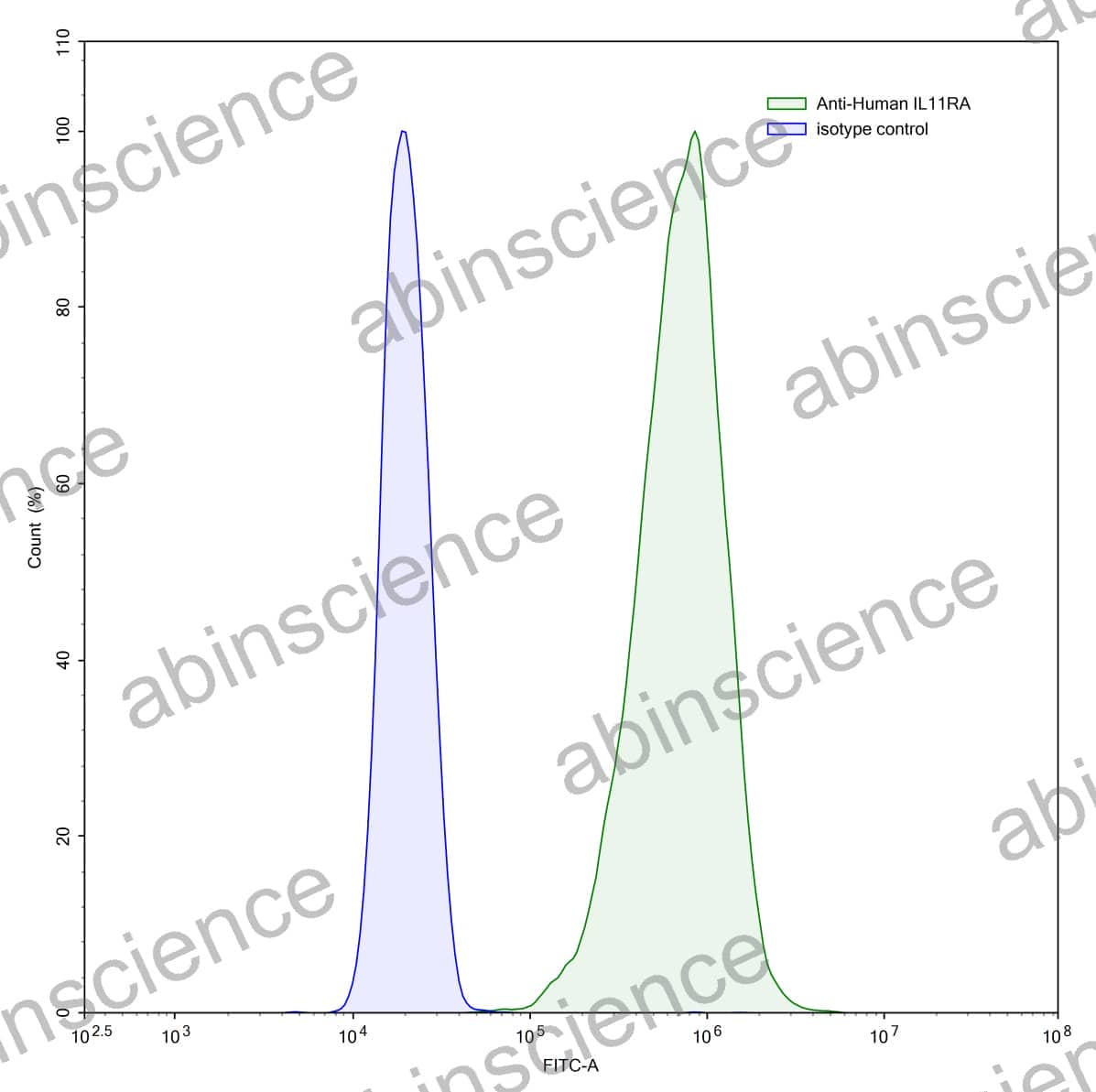 Flow-cytometry using anti-human IL11RA antibody.HeLa cells were stained with an irrelevant antibody (Blue Histogram) or an anti-human IL11RA antibody monoclonal antibody (Catalog # HC604013 ,Green Histogram) at a concentration of 5 µg/ml for 30 mins at RT. After washing, bound antibody was detected using a FITC conjugated goat anti-human antibody (Catalog # HF690414) and cells analysed on a NovoCyte Flow Cytometer.
