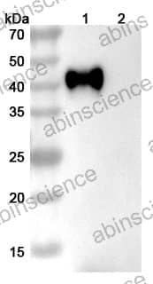 Western blot analysis was performed using anti-CD38 monoclonal antibody at 1ug/mL on various samples. Lane 1: recombinant human CD38 (Catalog No: HB691011) Lane 2: negative control