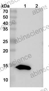 Western blot analysis was performed using anti-TIGIT monoclonal antibody at 1ug/mL on various samples. Lane 1: recombinant mouse TIGIT (Catalog No: MS739012) Lane 2: negative control