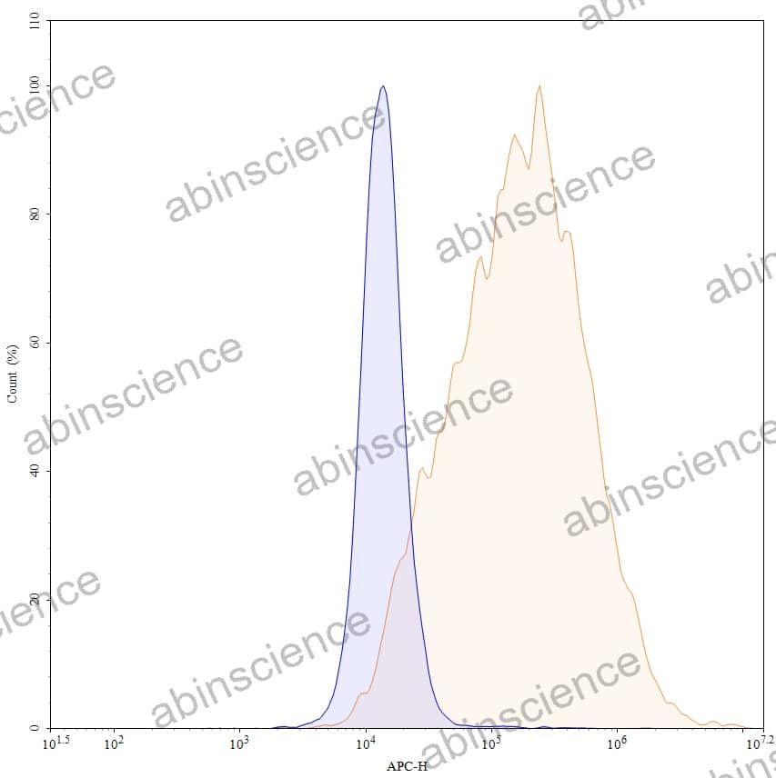 Flow-cytometry APC using anti-human CLDN18.2 antibody. Untransfected cells (blue Histogram) and Transfected cells (Yellow Histogram) were stained with an APC anti-human CLDN18.2 monoclonal antibody (Catalog HX126046) at a concentration of 5 µg/ml for 30 mins at RT. After washing, cells analysed on a NovoCyte Flow Cytometer.