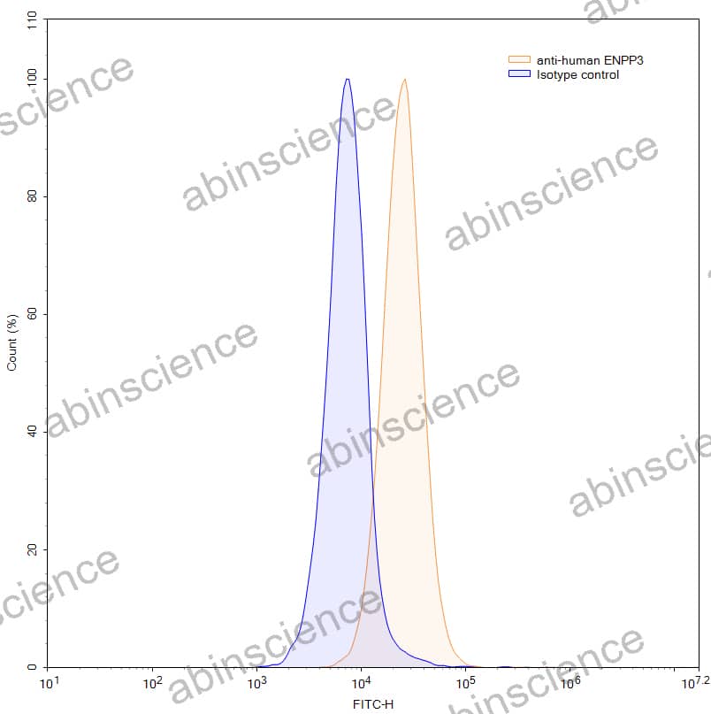 Untransfected cells or cells transfected with CD203c/ENPP3 were stained with an irrelevant antibody (Blue Histogram) or an anti-human CD203c monoclonal antibody (Catalog HT018016, Yellow Histogram) at a concentration of 5 µg/ml for 30 mins at RT. After washing, bound antibody was detected using a Goat Anti-Human IgG H&L Polyclonal Antibody, FITC (abinScience: HF690414) and cells analyzed on a NovoCyte Flow Cytometer. |
