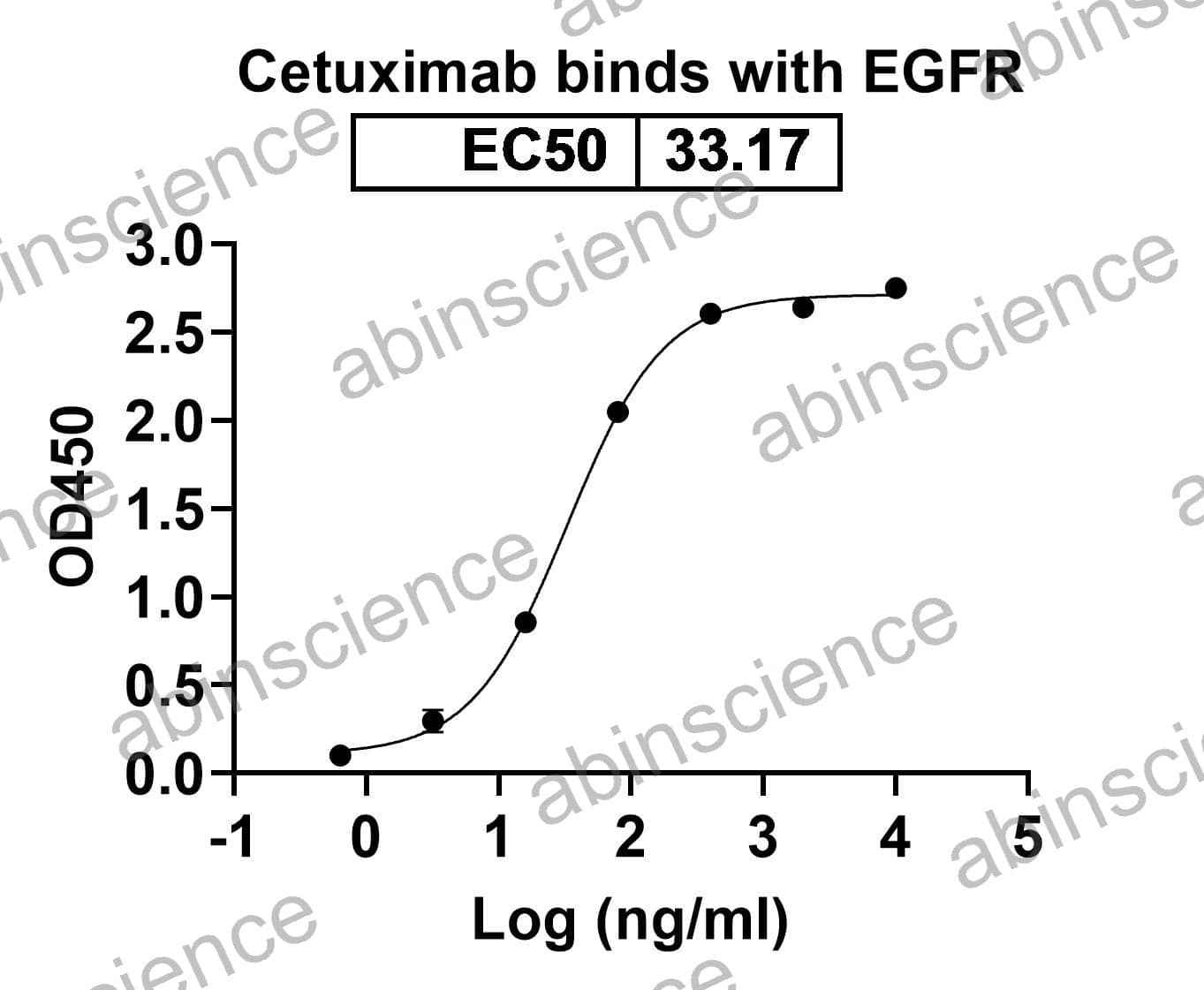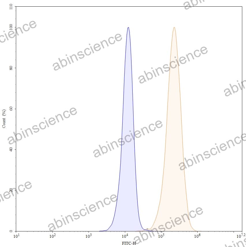 Flow-cytometry using anti-human EGFR antibody. Untransfected cells (blue Histogram) and Transfected cells (Yellow Histogram) were stained with an anti-human EGFR monoclonal antibody (Catalog: HF004026) at a concentration of 5 µg/ml for 30 mins at RT. After washing, bound antibody was detected using a Goat Anti-Human IgG H&L Polyclonal Antibody, FITC (abinScience: HF690414) and cells analysed on a NovoCyte Flow Cytometer. |