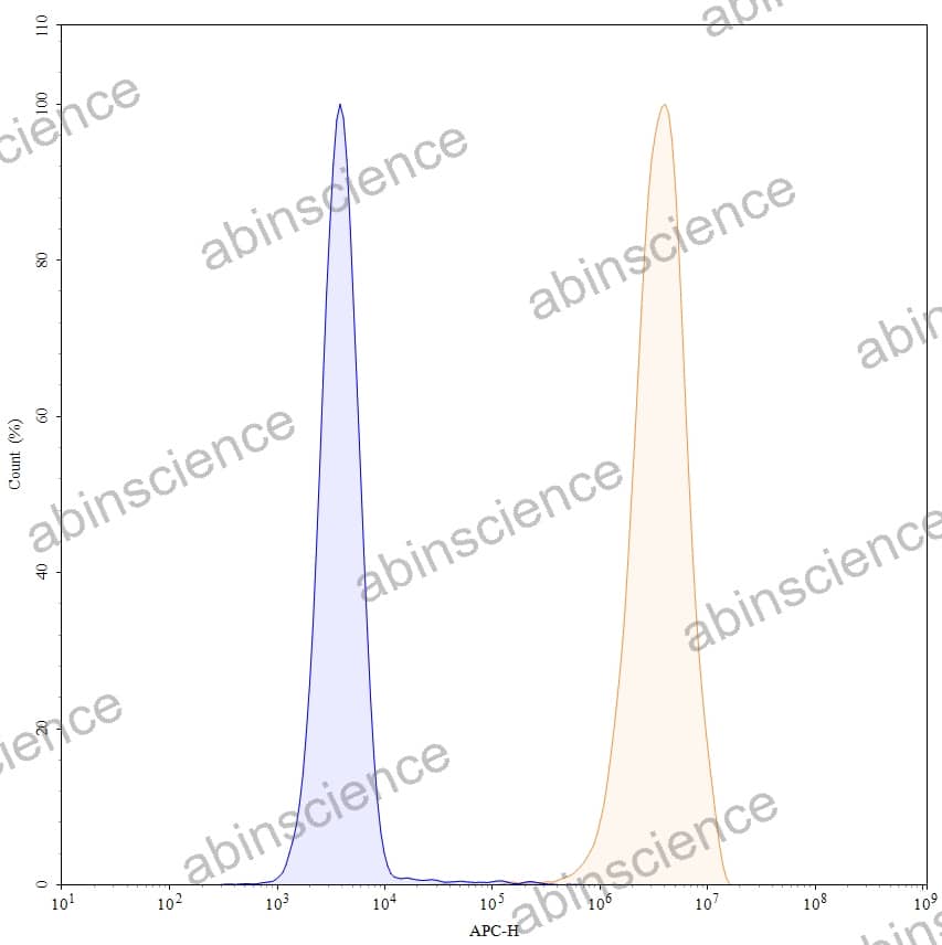 Flow-cytometry using APC anti-human EGFR antibody. A431 cells were stained with an irrelevant antibody (Blue Histogram) or an APC anti-human EGFR monoclonal antibody (Catalog: HF004026, Yellow Histogram) at a concentration of 5 µg/ml for 30 mins at RT. After washing, and cells analysed on a NovoCyte Flow Cytometer. |