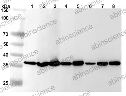 Western blot analysis was performed using anti-GAPDH polyclonal antibody at 1μg/ml on various samples. Lane 1: Hela cell lysate Lane 2: HepG2 cell lysate Lane 3: A549 cell lysate Lane 4: K562 cell lysate Lane 5: PC-3 cell lysate Lane 6: PC-12 cell lysate Lane 7: MCF-7 cell lysate Lane 8: HT-29 cell lysate