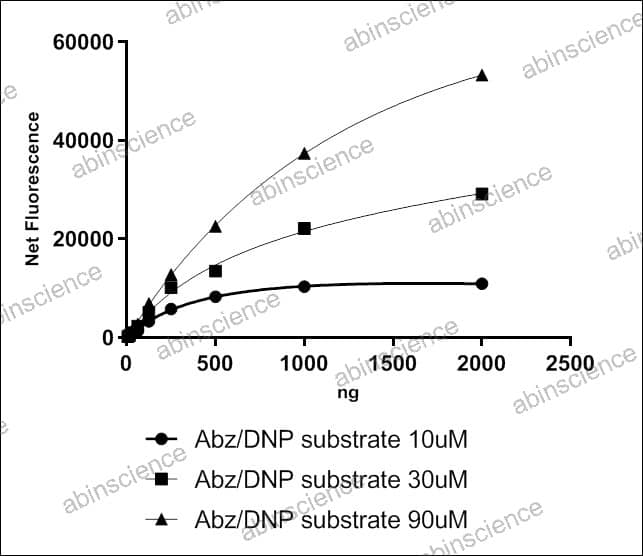 Sortase A (SrtA) could cleave and catalyze Sortase Substrate III, Abz/DNP. The Sortase A activity is tested by the cleavage of substrate and detecting at Ex/Em=320 nm/420 nm. |