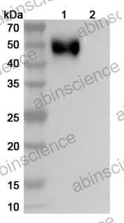Western blot analysis was performed using anti-CD172a/SIRPA monoclonal antibody at 1ug/mL on various samples. Lane 1: recombinant human CD172a/SIRPA (Catalog No: HX892011) Lane 2: negative control