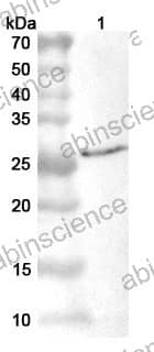 Western blot analysis was performed using anti-VP8-VACCW polyclonal antibody at 1ug/mL on various samples. Lane 1: recombinant Vaccinia virus/VACV L4R/VP8 (Catalog No: VK005012)