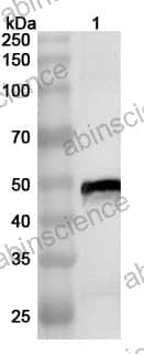 Western blot analysis was performed using anti-CHIKV-E1 polyclonal antibody at 1ug/mL on various samples. Lane 1: recombinant CHIKV Spike glycoprotein E1 (Catalog No: VK425012)
