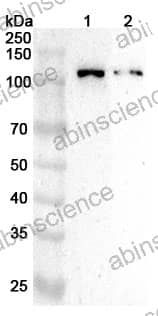 Western blot analysis was performed using anti-CUL1 polyclonal antibody at 1ug/mL on various samples. Lane 1: Mouse brain lysate Lane 2: Rat brain lysate