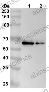 Western blot analysis was performed using anti-CEP55 polyclonal antibody at 1ug/mL on various samples. Lane 1: Jurkat cell lysate Lane 2: Hela cell lysate