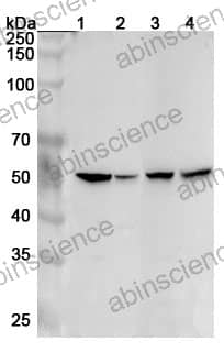 Western blot analysis was performed using anti-HTR2A polyclonal antibody at 1ug/mL on various samples. Lane 1: Mouse brain lysate Lane 2: Mouse cerebellum lysate Lane 3: Rat brain lysate Lane 4: Rat cerebellum lysate