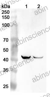 Western blot analysis was performed using anti-PDGFC polyclonal antibody at 1ug/mL on various samples. Lane 1: Mouse liver lysate Lane 2: Rat liver lysate