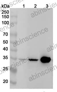 Western blot analysis was performed using anti-TYMS polyclonal antibody at 1ug/mL on various samples. Lane 1: Hela cell lysate Lane 2: 293T cell lysate Lane 3: Jurkat cell lysate