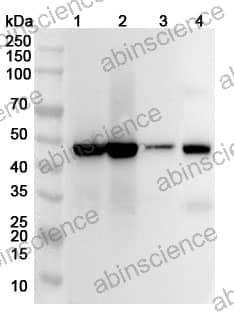 Western blot analysis was performed using anti-TXNDC5 polyclonal antibody at 1ug/mL on various samples. Lane 1: Mouse stomach lysate Lane 2: Mouse colon lysate Lane 3: Mouse skeletal muscle lysate Lane 4: Rat colon lysate