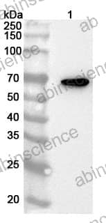 Western blot analysis was performed using anti-HEXIM1 polyclonal antibody at 1ug/mL on various samples. Lane 1: Jurkat cell lysate