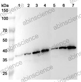 Western blot analysis was performed using anti-ZWINT polyclonal antibody at 1ug/mL on various samples. Lane 1: HepG2 cell lysate Lane 2: SW620 cell lysate Lane 3: 293T cell lysate Lane 4: Jurkat cell lysate Lane 5: Hela cell lysate Lane 6: Raji cell lysate Lane 7: K562 cell lysate