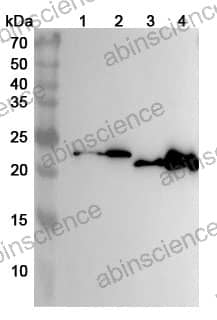 Western blot analysis was performed using anti-AK1 polyclonal antibody at 1ug/mL on various samples. Lane 1: Mouse heart lysate Lane 2: Mouse skeletal muscle lysate Lane 3: Rat heart lysate Lane 4: Rat skeletal muscle lysate