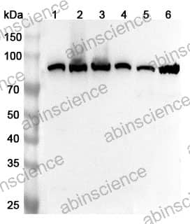 Western blot analysis was performed using anti-MMUT polyclonal antibody at 1ug/mL on various samples. Lane 1: Mouse heart lysate Lane 2: Mouse kidney lysate Lane 3: Mouse liver lysate Lane 4: Rat heart lysate Lane 5: Rat kidney lysate Lane 6: Rat liver lysate