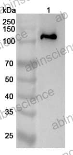 Western blot analysis was performed using anti-GLDC polyclonal antibody at 1ug/mL on various samples. Lane 1: Caco2 cell lysate