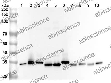 Western blot analysis was performed using anti-C1QBP polyclonal antibody at 1ug/mL on various samples. Lane 1: Hela cell lysate Lane 2: Jurkat cell lysate Lane 3: K562 cell lysate Lane 4: PC-12 cell lysate Lane 5: C2C12 cell lysate Lane 6: A549 cell lysate Lane 7: Mouse spleen lysate Lane 8: Mouse lung lysate Lane 9: Rat spleen lysate Lane 10: Rat lung lysate