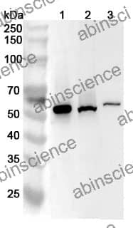 Western blot analysis was performed using anti-CCNA2 polyclonal antibody at 1ug/mL on various samples.
