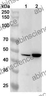 Western blot analysis was performed using anti-TRIB3 polyclonal antibody at 1ug/mL on various samples. Lane 1: LO2 cell lysate Lane 2: PC-3 cell lysate