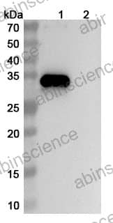 Western blot analysis was performed using anti-CD269 monoclonal antibody at 1ug/mL on various samples. Lane 1: recombinant human CD269 (Catalog No: HX959012) Lane 2: negative control