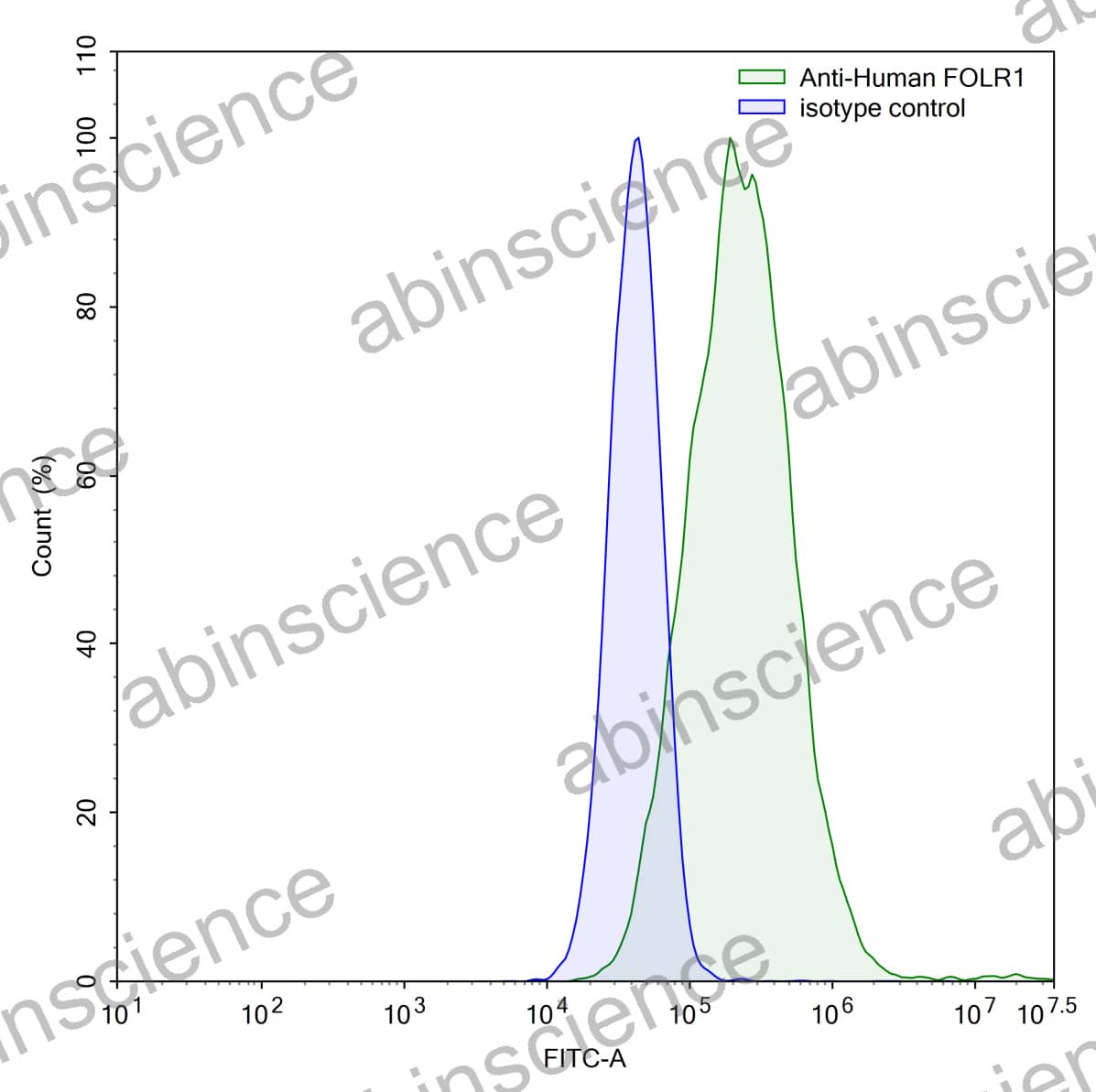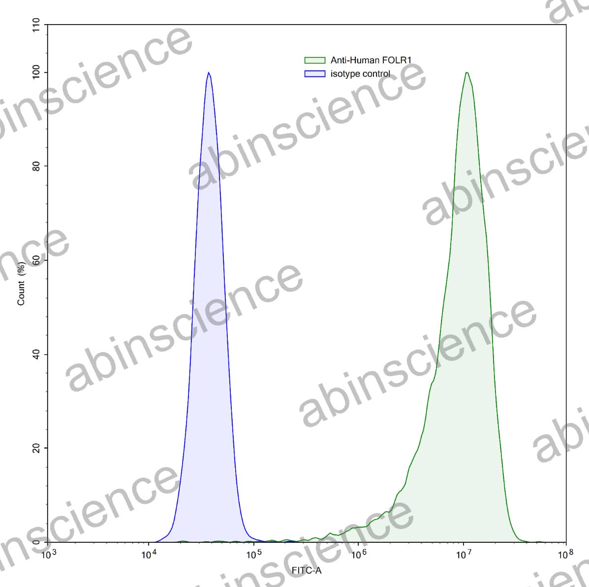 Flow-cytometry using anti-human FOLR1 antibody.HeLa cells were stained with an irrelevant antibody (Blue Histogram) or an anti-human FOLR1 antibody monoclonal antibody (Catalog # HB825107 ,Green Histogram) at a concentration of 5 µg/ml for 30 mins at RT. After washing, bound antibody was detected using a FITC conjugated goat anti-human antibody (Catalog # HF690414) and cells analysed on a NovoCyte Flow Cytometer. |