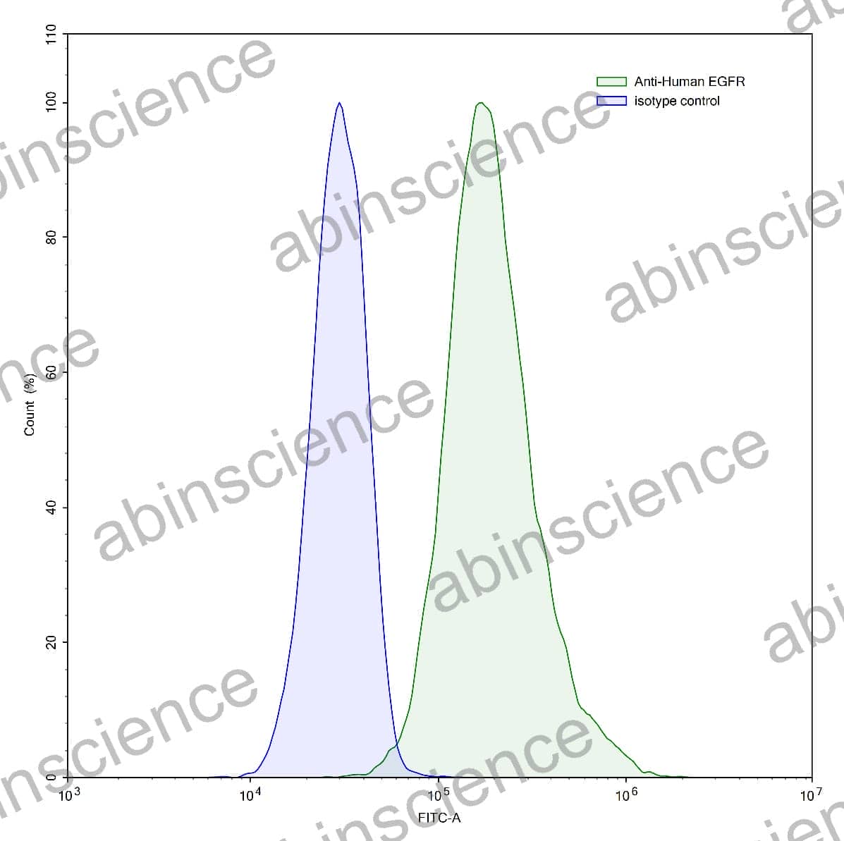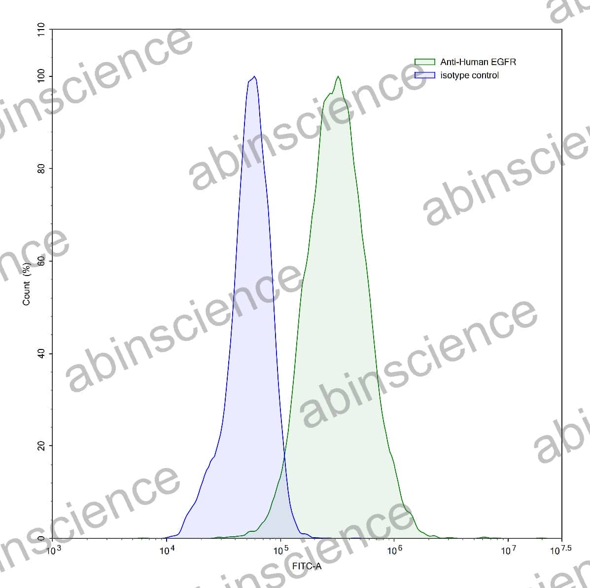 Flow-cytometry using anti-human EGFR antibody.A431 cells were stained with an irrelevant antibody (Blue Histogram) or an anti-human EGFR antibody monoclonal antibody (Catalog # HF004207 ,Green Histogram) at a concentration of 5 ug/ml for 30 mins at RT. After washing, bound antibody was detected using a FITC conjugated goat anti-human antibody (Catalog # HF690414) and cells analysed on a NovoCyte Flow Cytometer.