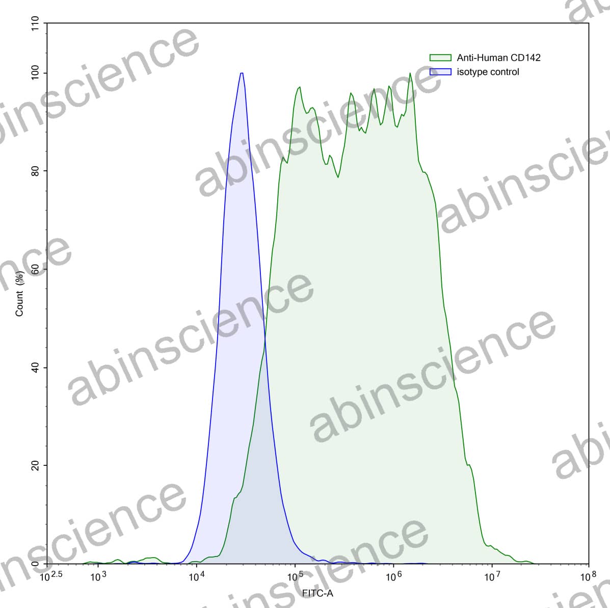 Flow-cytometry using anti-human CD142 antibody.CD142 Transfected CHO cells were stained with an irrelevant antibody (Blue Histogram) or an anti-human CD142 antibody monoclonal antibody (Catalog # HB058107 ,Green Histogram) at a concentration of 5 µg/ml for 30 mins at RT. After washing, bound antibody was detected using a FITC conjugated goat anti-mouse antibody (Catalog # MF690414) and cells analysed on a NovoCyte Flow Cytometer. |