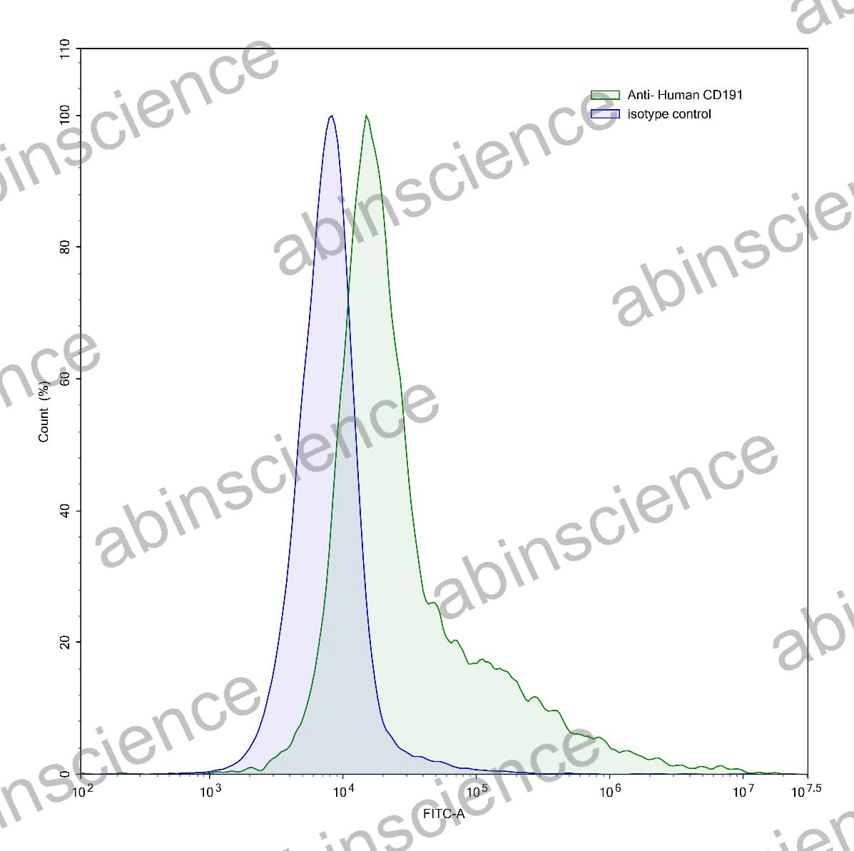 Flow-cytometry using anti-human CD191 antibody.Human peripheral blood lymphocytes were stained with an irrelevant antibody (Blue Histogram) or an anti-human CD191 antibody monoclonal antibody (Catalog # HB896107 ,Green Histogram) at a concentration of 5 µg/ml for 30 mins at RT. After washing, bound antibody was detected using a FITC conjugated goat anti-mouse antibody (Catalog # MF690414) and cells analysed on a NovoCyte Flow Cytometer. |
