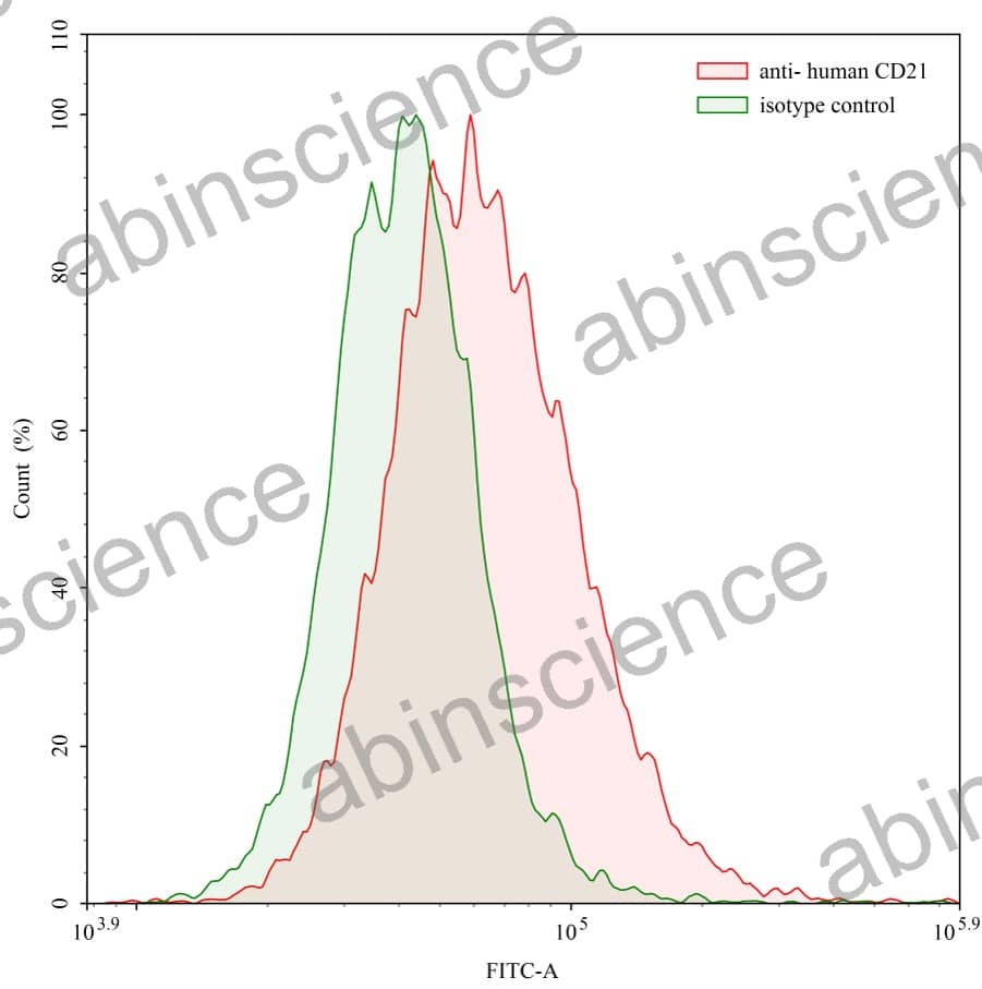 Flow-cytometry using anti-human CD21 antibody. Human Jurkat cell line were stained with an irrelevant antibody (Green Histogram) or an anti-human CD21 antibody monoclonal antibody (Catalog # HB939107 , Red Histogram) at a concentration of 20 µg/ml for 30 mins at RT. After washing, bound antibody was detected using a CoraLite488 conjugated goat anti-mouse antibody (Catalog # MF690314) and cells analysed on a NovoCyte Flow Cytometer.