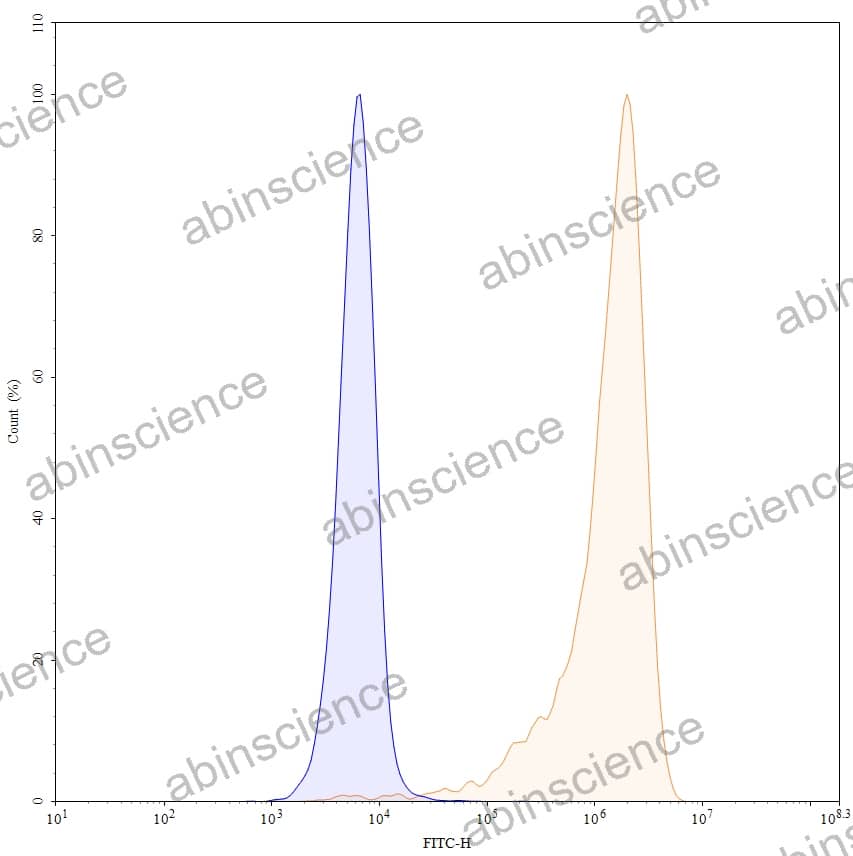 Flow-cytometry using anti-human CD27 antibody. Untransfected cells (blue Histogram) and Transfected cells (Yellow Histogram) were stained with an anti-human CD27 monoclonal antibody (Catalog: HB796107) at a concentration of 5 µg/ml for 30 mins at RT. After washing, bound antibody was detected using a Goat Anti-Mouse IgG H&L Polyclonal Antibody, FITC (abinScience: MF690414) and cells analysed on a NovoCyte Flow Cytometer. |
